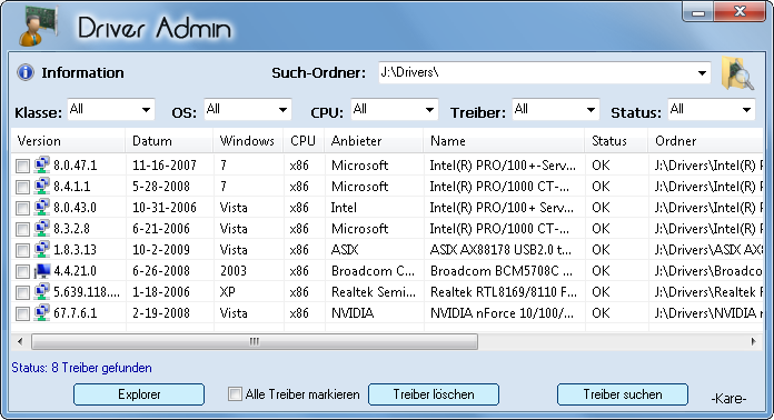 Driver Admin sucht Treiber nach bestimmten Kriterien und listet sie auf