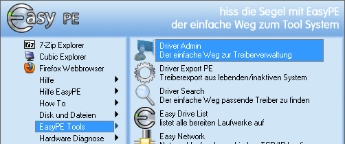 Driver Admin unterstützt die Treiberadministration für alle Windows 32Bit und 64Bit Systeme Das Programm DriverAdmin befindet sich im EasyPE Menü in den EasyPE Tools.
