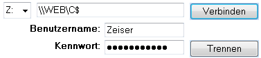Eingabe der VerbindungsdatenDer lokale Laufwerksbuchstabe Die Freigabe (Computername & Freigabename) Der Benutzername Das Kennwort Sind alle Eingaben korrekt angegeben, wird die Verbindung mit Klick auf die Schaltfläche Verbinden hergestellt.