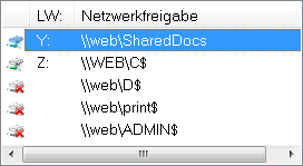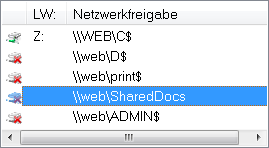 Sind alle Angaben korrekt eingegeben, erscheint mit Klick auf die Schaltfläche Verbinden die gewünschte Netzwerkverbindung. Der für diese Verbindung angegebene bzw. nächste freie lokale Laufwerksbuchstabe erscheint in der Spalte LW:. Alle zusätzlich verfügbaren Freigaben des verbundenen Servers werden in der