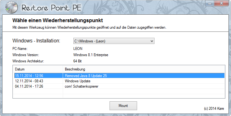 Mit RestPoPE.exe kann in laufenden Windows Systemen für Workstations und in EasyPE direkt auf die Restorepoints (Wiederherstellungspunkte, Systemwiederherstellung) zugegriffen werden. Zugehörige Seminare: Windows easy fix pro bzw. Virus easy defense pro mit praktischen Beispielen. Ein Wiederherstellungspunkt wird mit Hilfe des Dienstes VSS, der Schattenkopien erstellt, angelegt. Bei Problemen im Windows System kann das System auf einen vorhandenen Wiederherstellungspunkt und somit auf einen früheren Systemstatus zurückgesetzt werden. Vor der Installation eines Programms oder eines Treibers sollte immer ein Wiederherstellungspunkt erstellt werden. Normalerweise wird ein Wiederherstellungspunkt automatisch bei Installation neuer Software, neuer Treiber oder Patches erstellt. Dies muss jedoch nicht immer der Fall sein. Zur Sicherheit sollte daher vor jeder Systemänderung ein Wiederherstellungspunkt manuell erstellt werden. Nach dem Start des Programms RestPoPE.exe zeigt das Dialogfenster die gefundenen Windows Installationen mit zugehörigen Wiederherstellungspunkten.